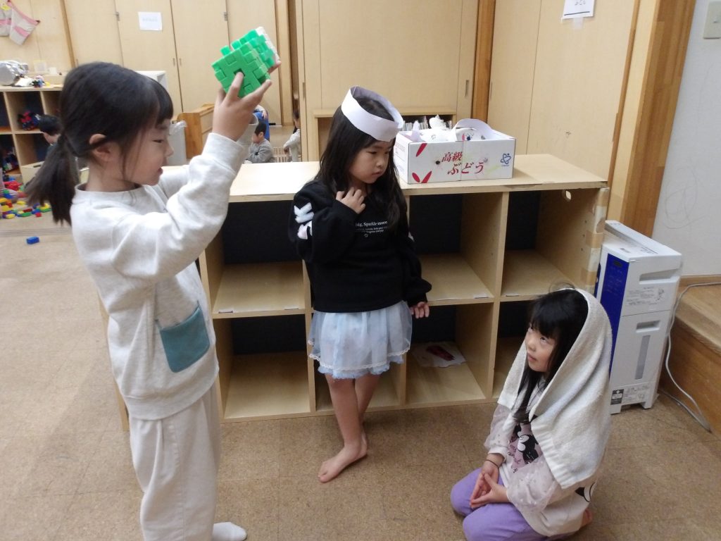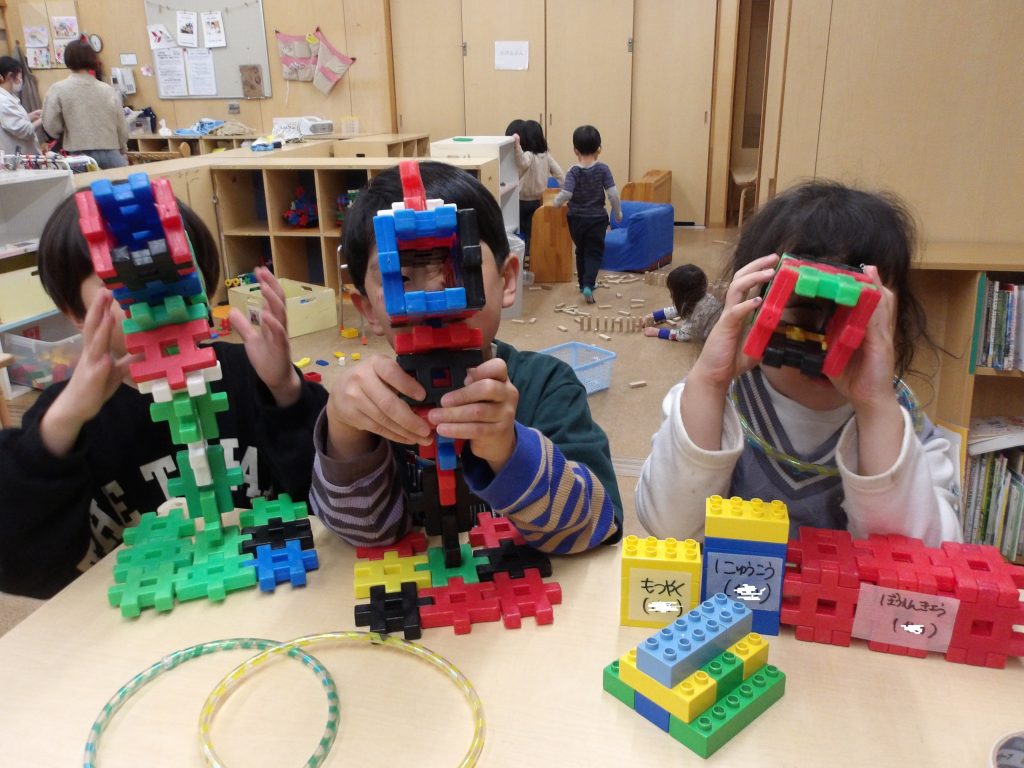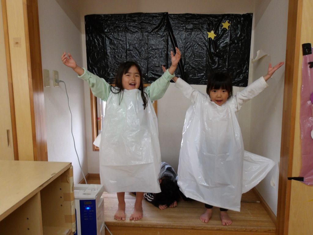 幼児部では、クリスマスの絵本やアドベント礼拝を通して、クリスマスの日の出来事を知り、保育者と一緒にクリスマスの研究をしたり、ページェント(聖誕劇)を楽しむ中で、手作りの衣装を作ったり、ブロックでマリアのゆりの花や羊飼いの杖、博士の望遠鏡や3つの贈り物などを表現していました。