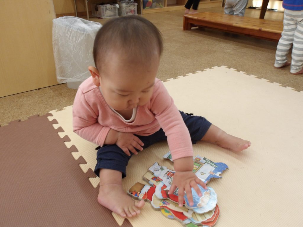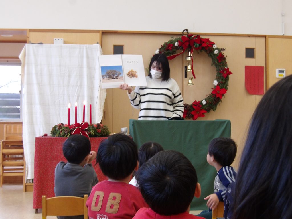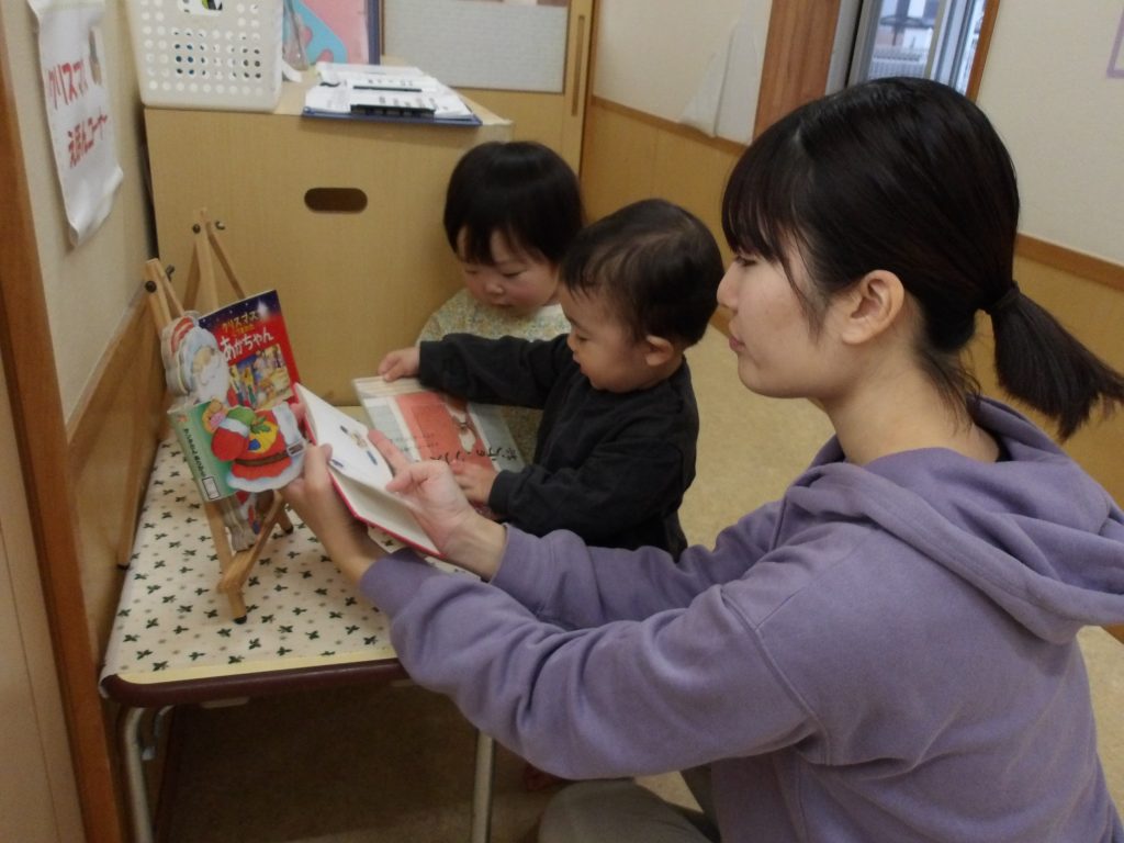 乳児部では、クリスマスの絵本コーナーがあり、子どもたちが手に取ったり、保育者と一緒に読むことを楽しんでいます。