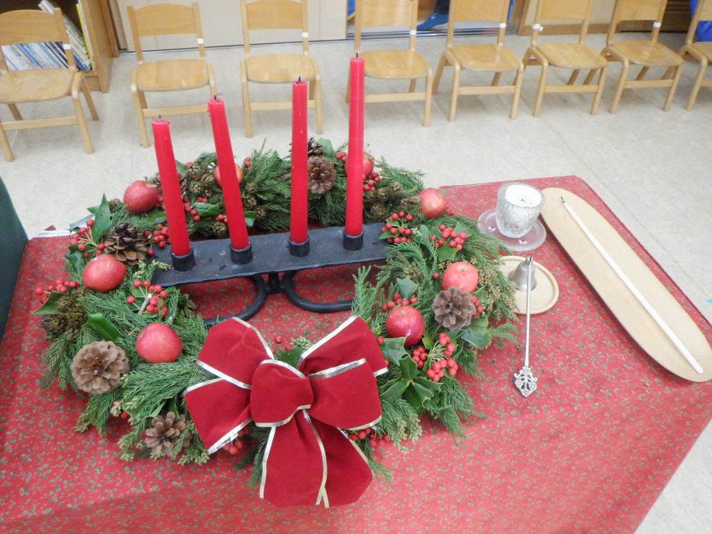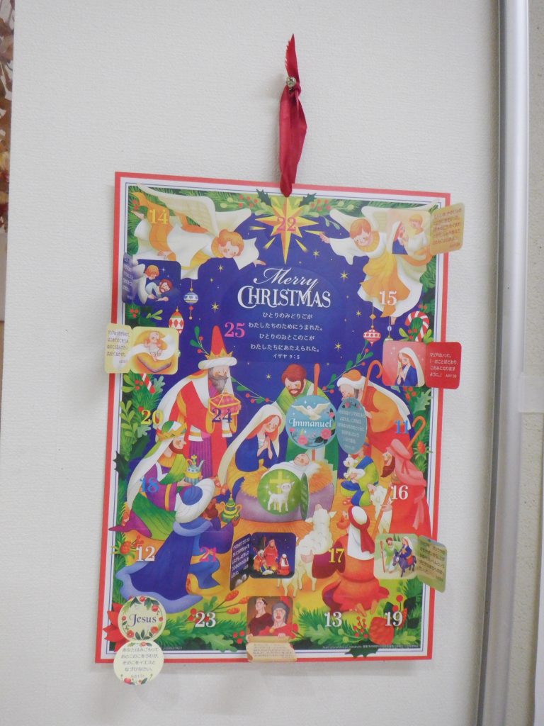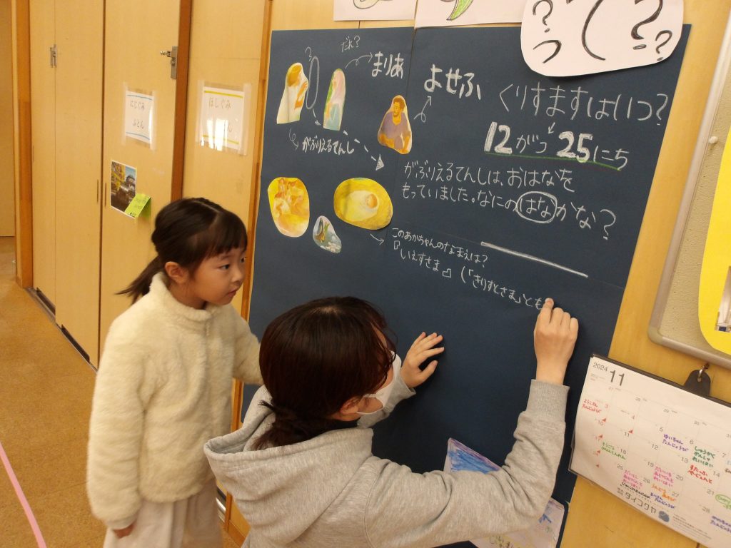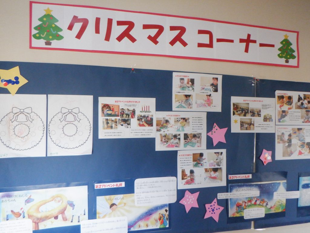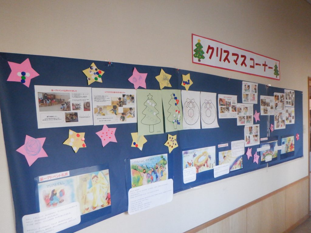 廊下にはクリスマスコーナーを設け、アドベント礼拝やクリスマス制作の様子の写真を貼ったり、クリスマスの日の出来事のお話を掲示しています。