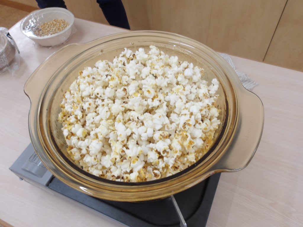 自分たちで作ったポップコーンは格別です!おかわりしてたくさん食べていました。