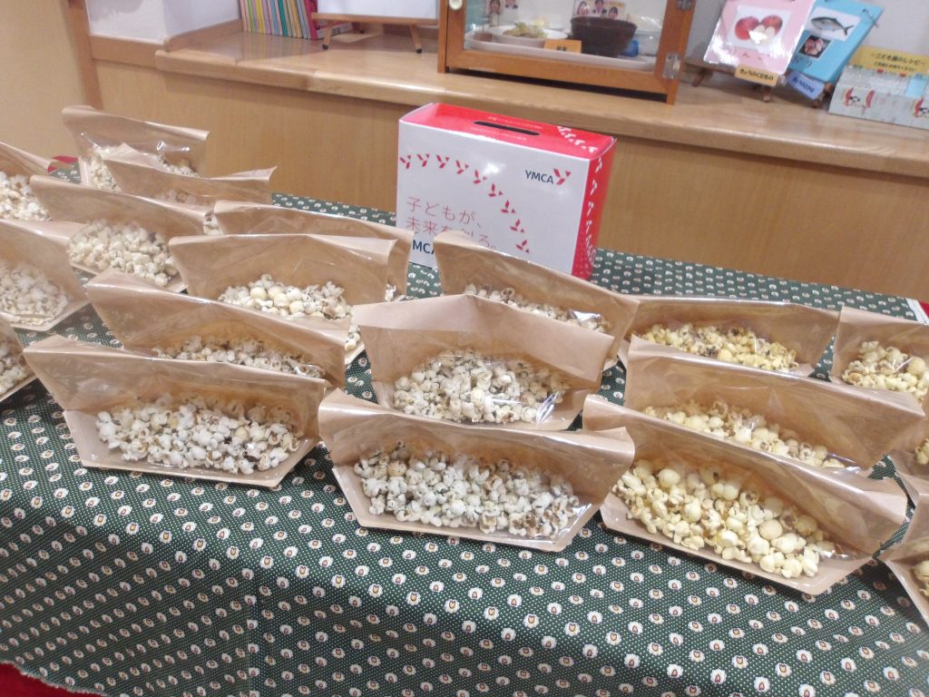 子どもたちと作ったポップコーンは「国際地域協力募金」の一環として販売も行いました。