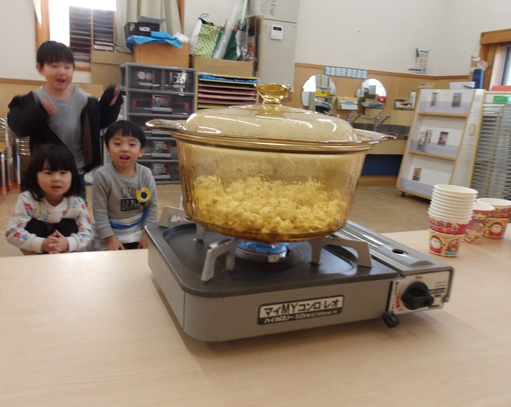 3歳児ほし組では、12月25日(水)のクリスマスの日に「ポップコーンパーティー」を開催しました。ポンポンと弾ける音がすると「わー!」と歓声が上がりました。