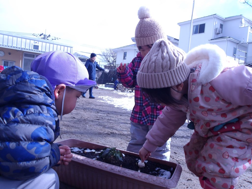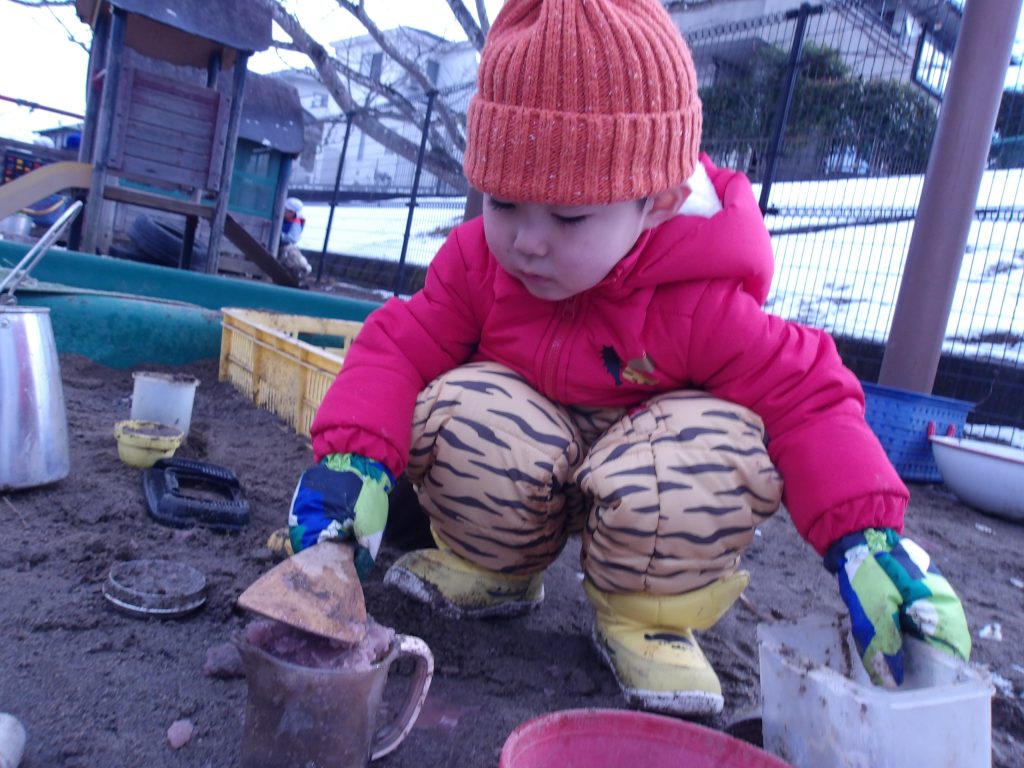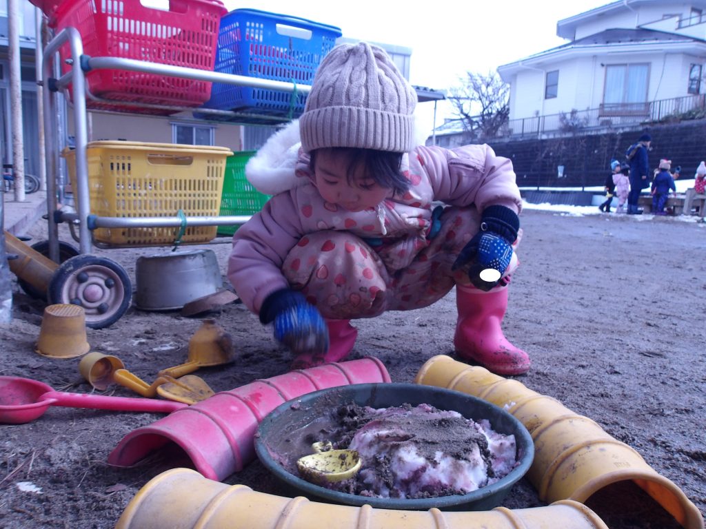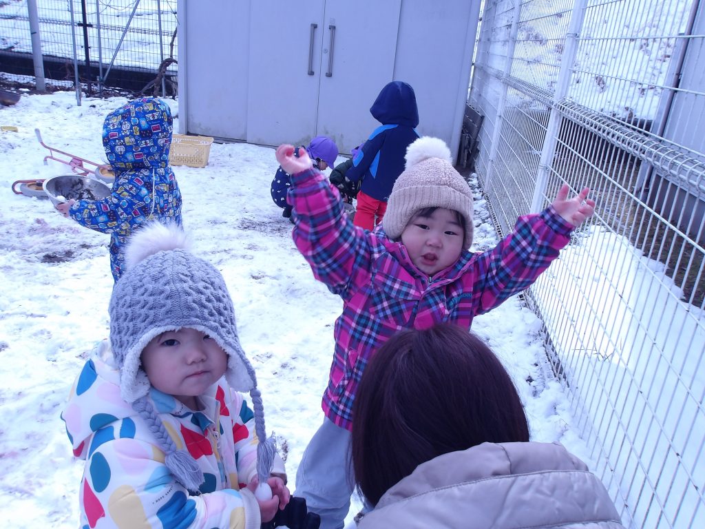 雪に触れて、冷たさを感じたり、形が変わるのを楽しんだり、雪遊びの中で様々なことに気づき、学んでいる子どもたちです。今しか出来ない経験を大事に過ごしていきます。