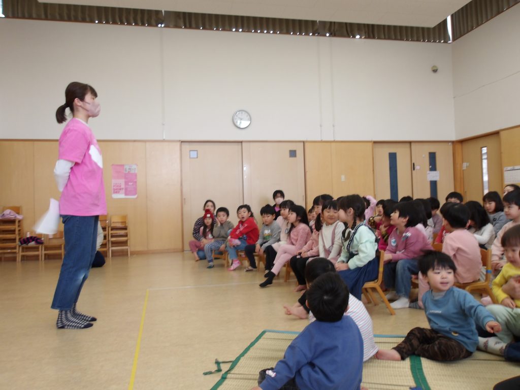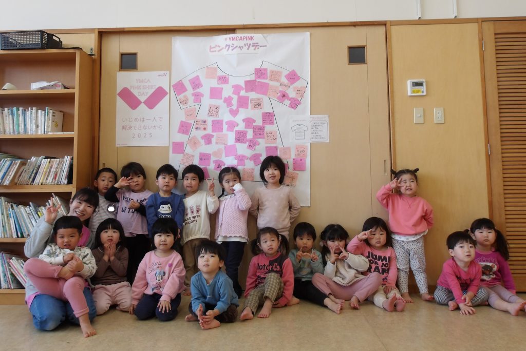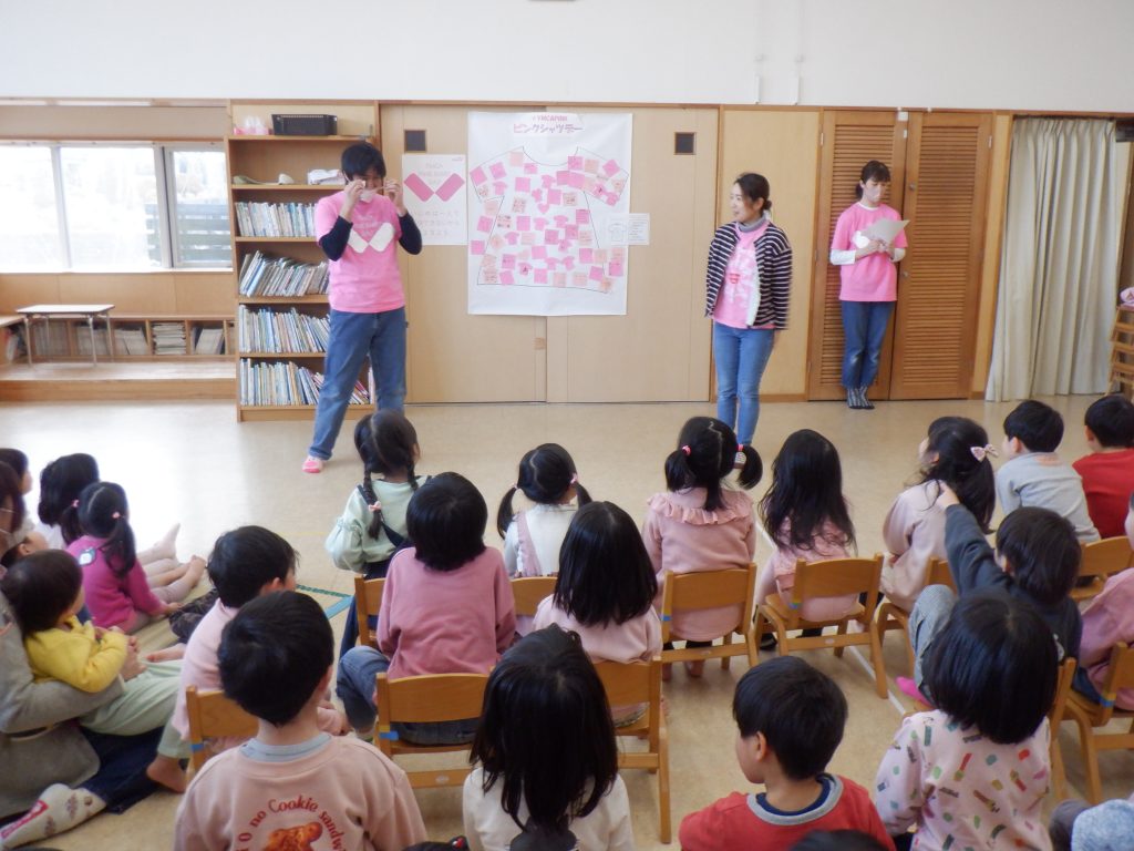 ピンクシャツデーのお話を聞いたり、劇を見たことで、子どもたちもいろいろな思いを抱いたようです。「(遊びに)まぜてって言った時に、男の子はダメって言われたことがあった」と話す子がいて、「そう言われたら悲しいよね」「そうだよね」とみんなで共感しあい、改めて考える機会にもなりました。