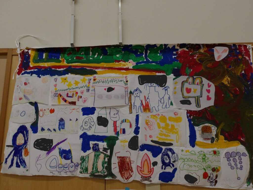 キャンプで楽しみなことを一人ひとり描いて一つの大きな旗にしました♪