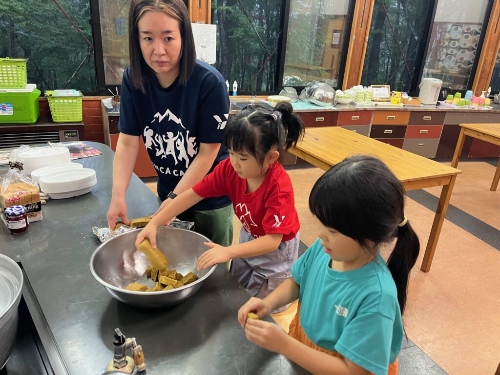 雨のため、野外炊飯ではなく、室内でカレー作り。