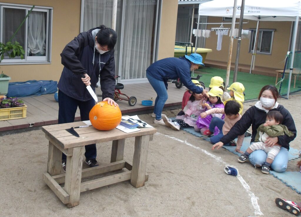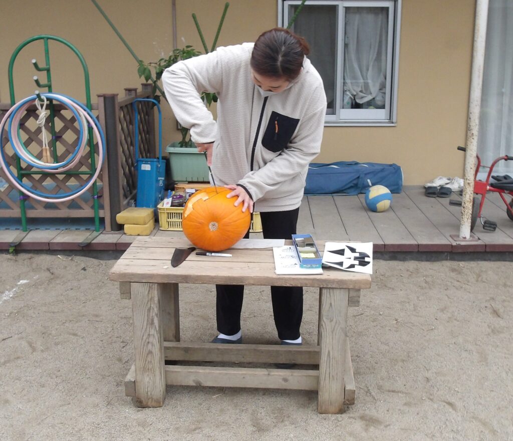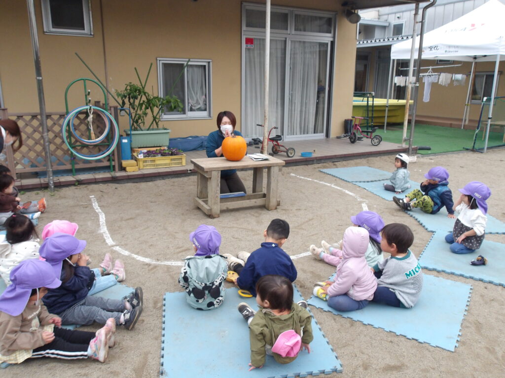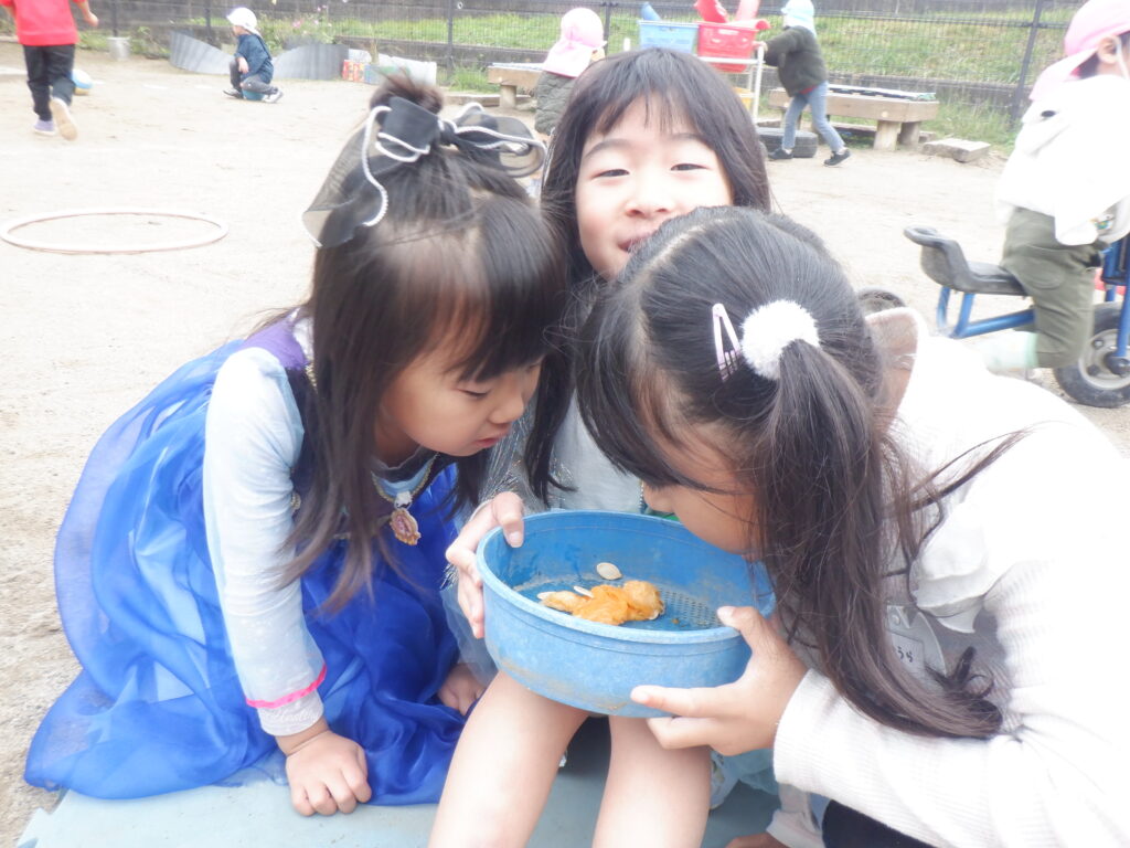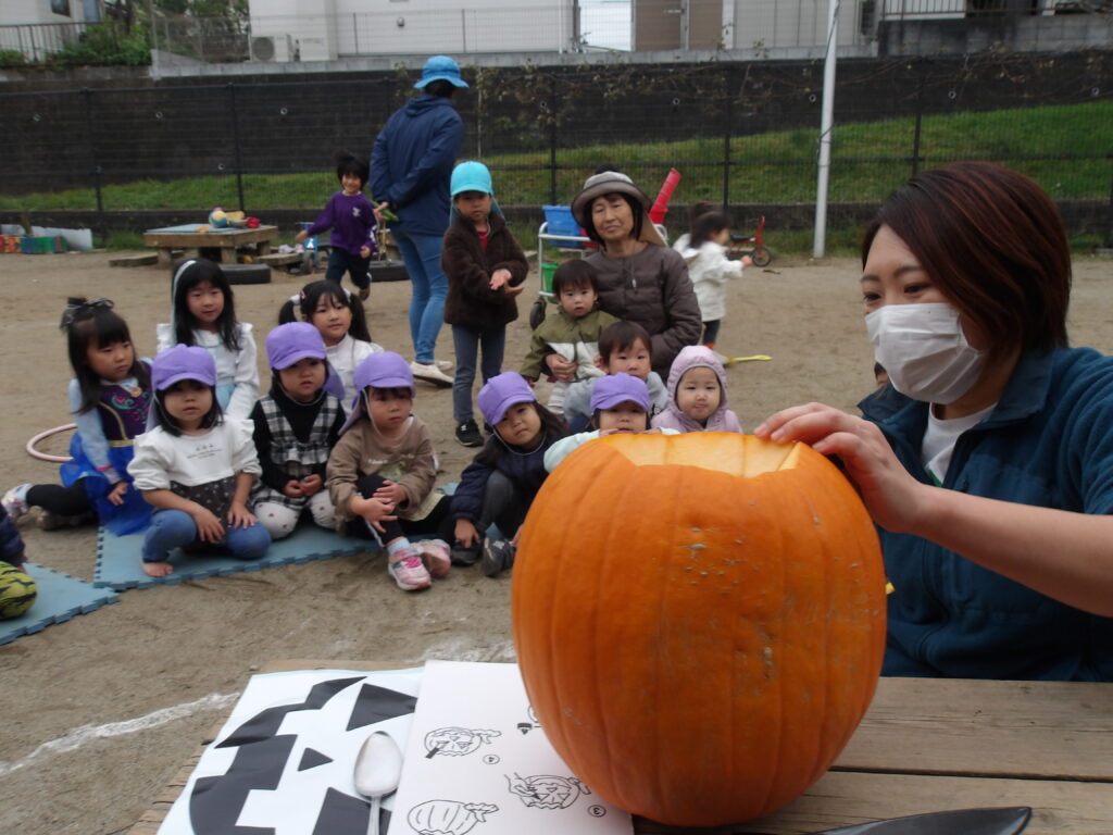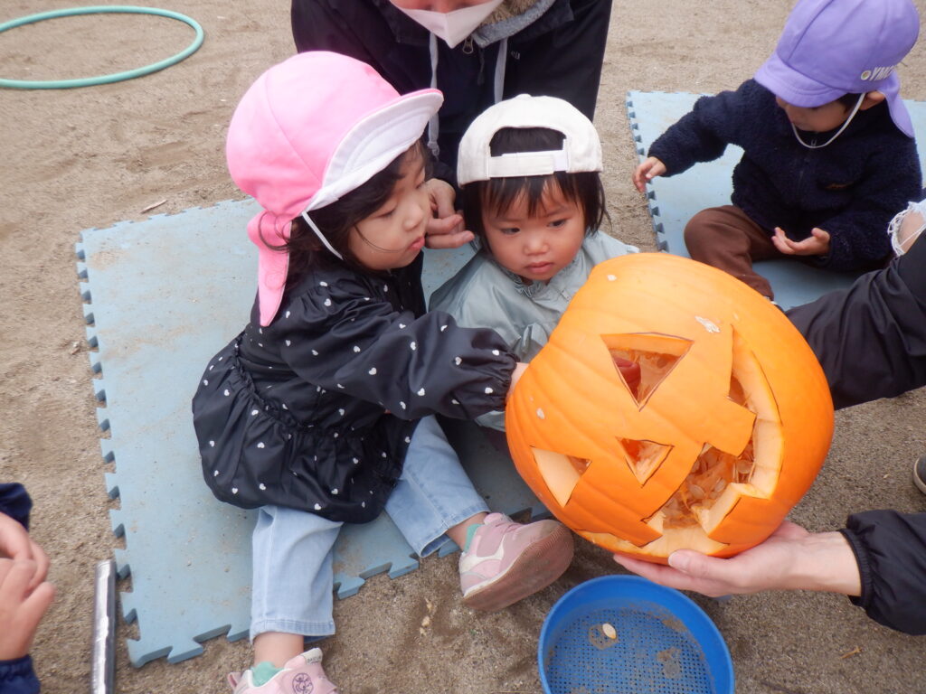夕方、園庭で遊んでいる時もカボチャの種を使ってケーキ作りを行うほど、1日を通してカボチャに触れ、存分に楽しんだ子どもたちでした⭐