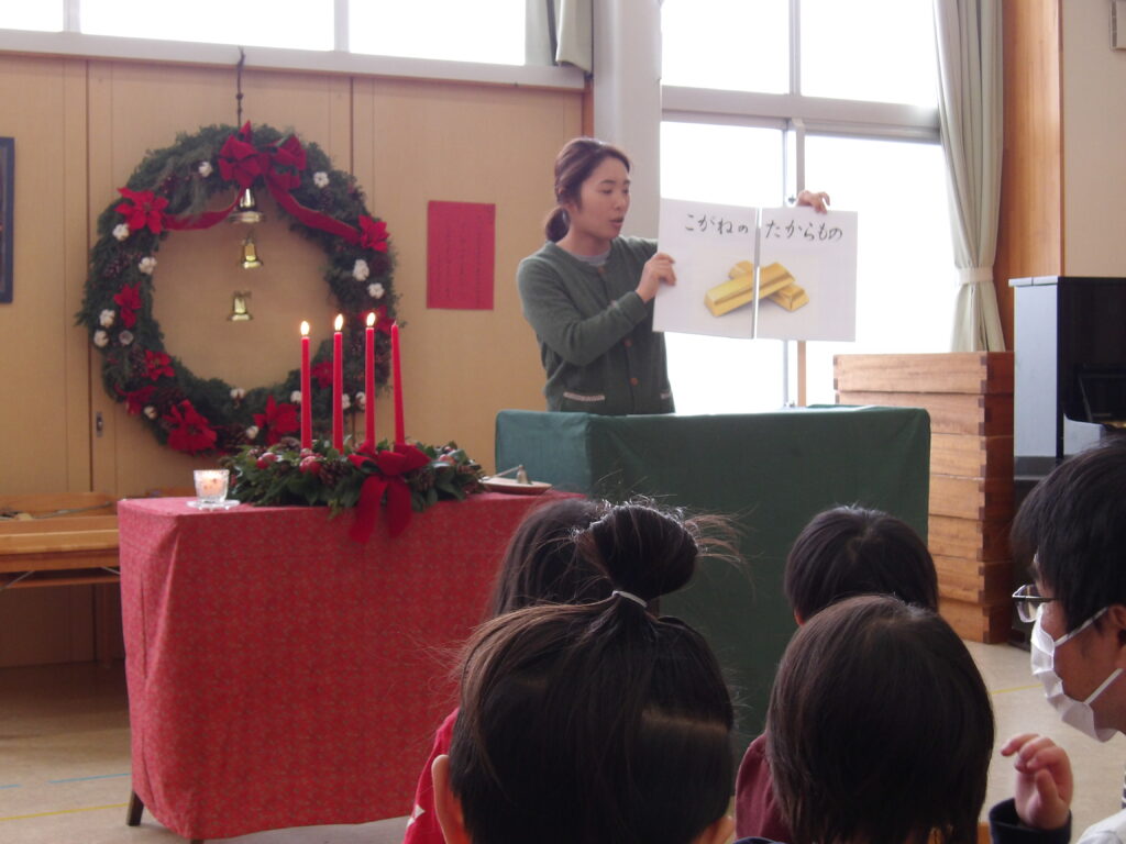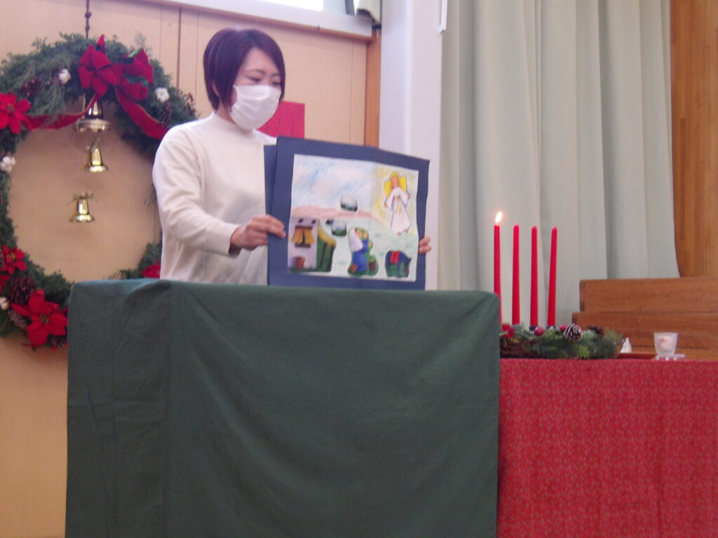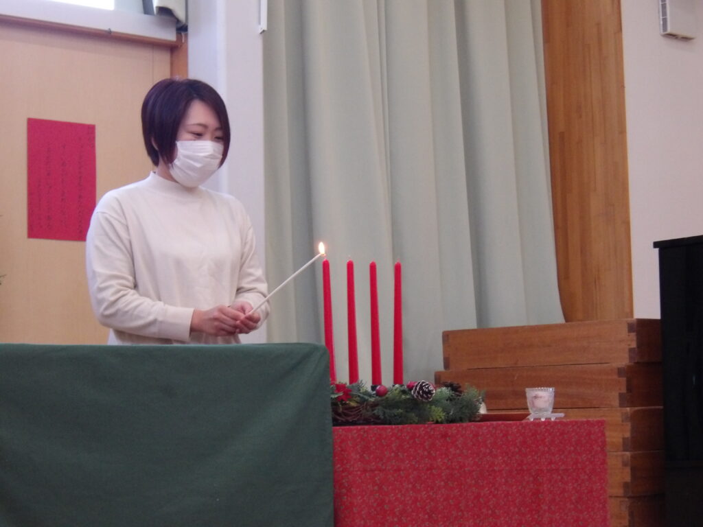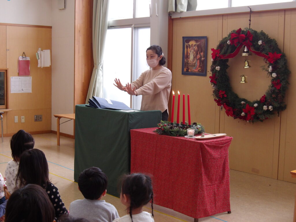 第一アドベント礼拝では、マリア様がガブリエル天使のお告げを聞く場面の紙芝居を見たり、讃美歌を歌ってクリスマスの雰囲気を感じることができました。 アドベントクランツに明かりが灯ったときは、全員が惹きつけられていました。