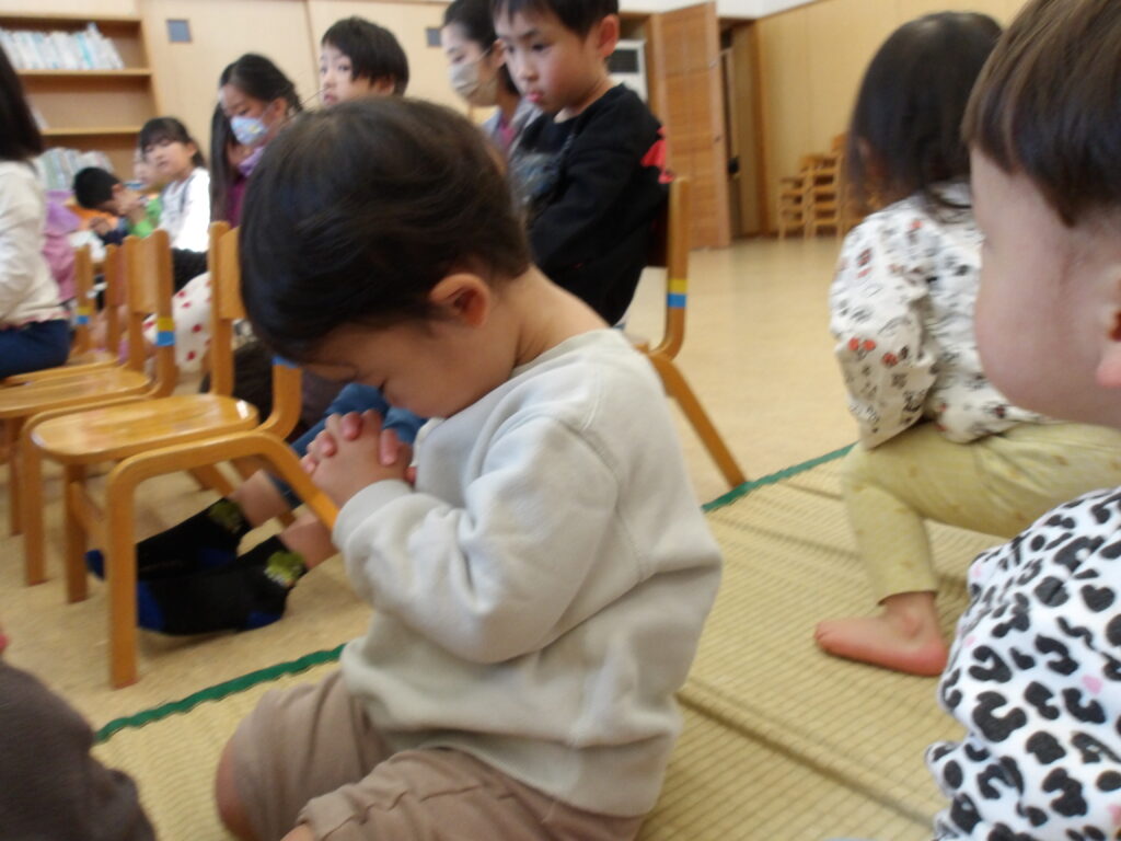 3・4・5歳児と一緒に、2歳児も礼拝に参加しました。ぺージェントごっこもわくわくしながら、見ています。