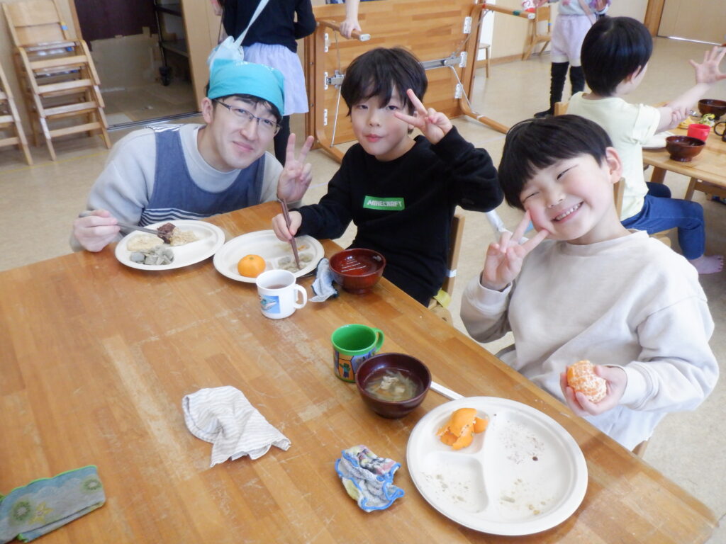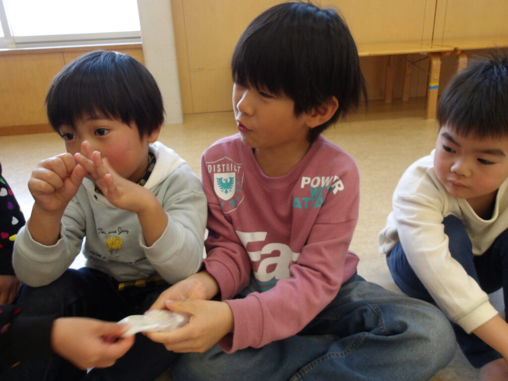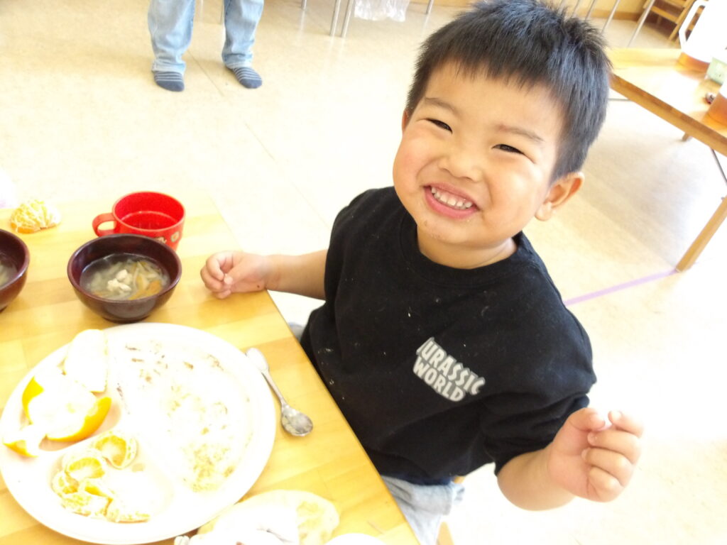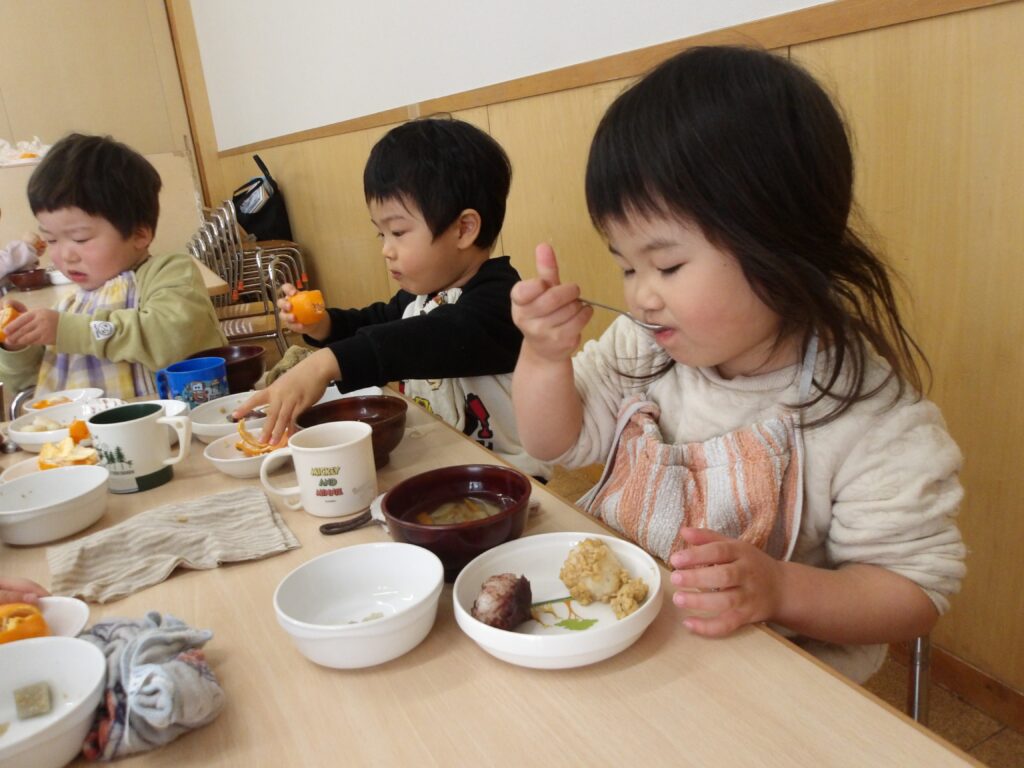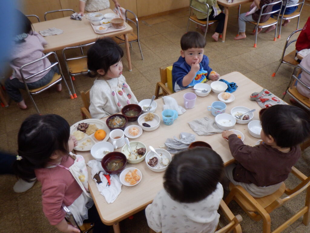 もちつきの後は、乳児さんはおはぎを、幼児さんはつきたてのおもちをいただきました😊