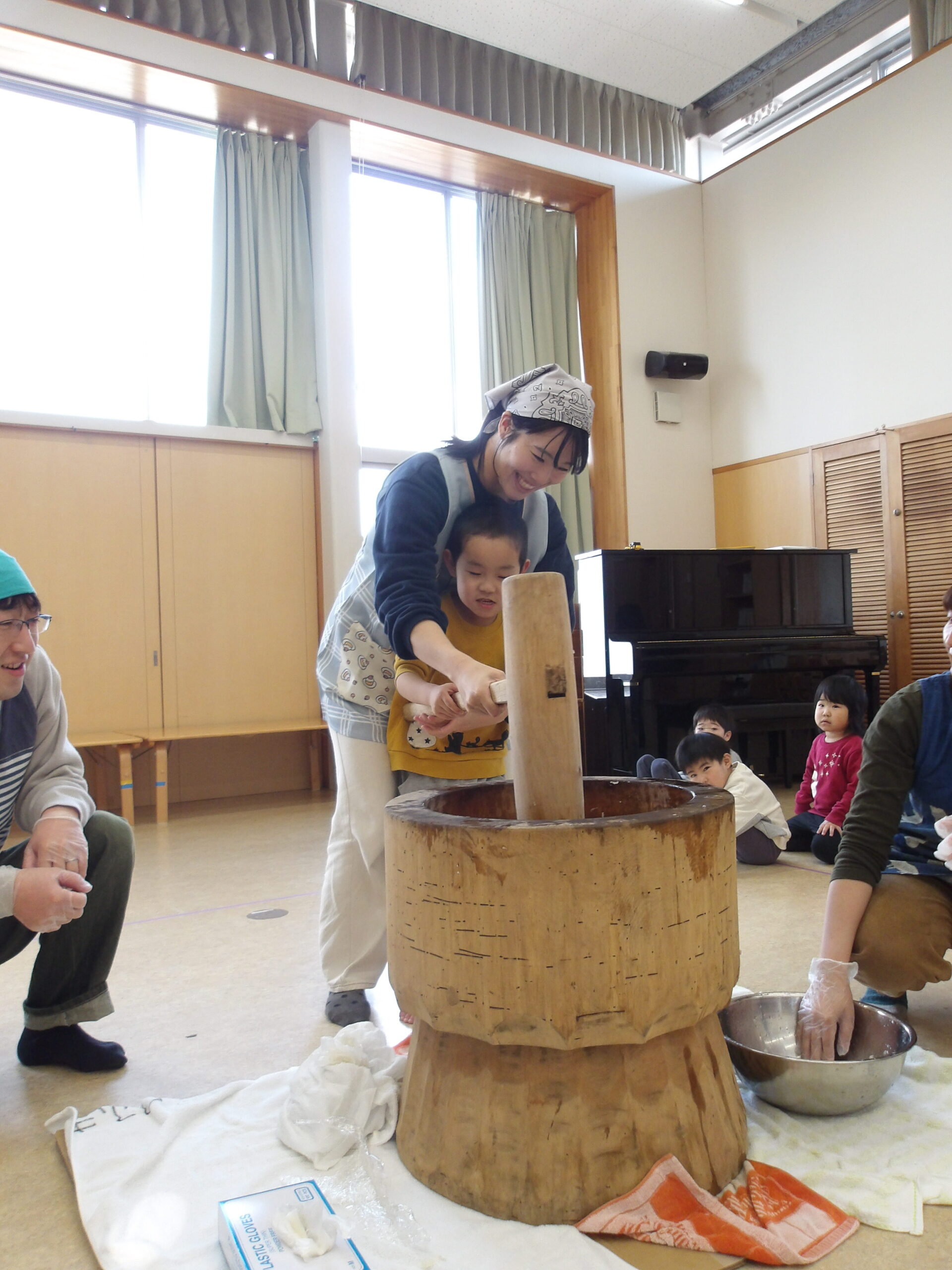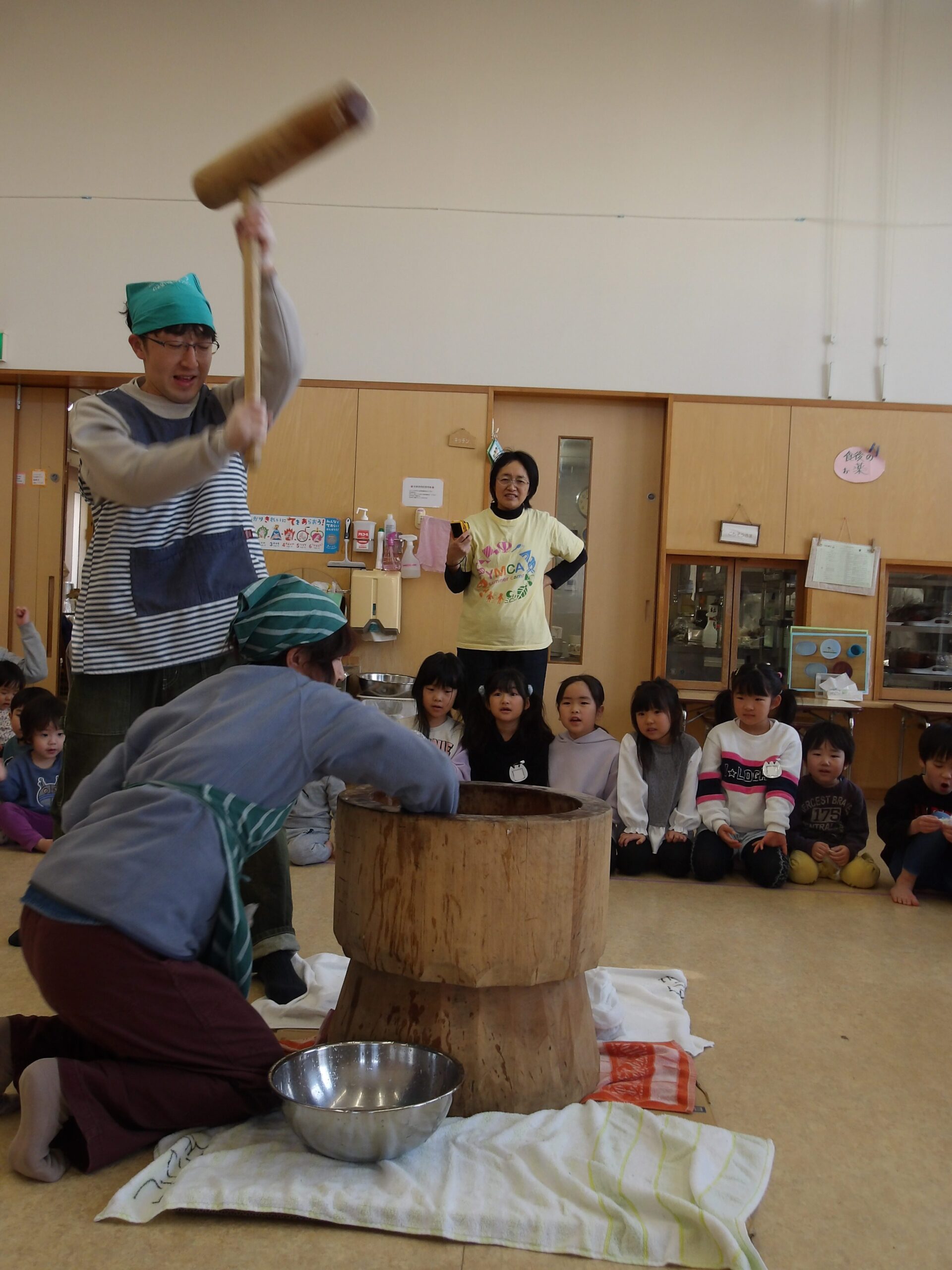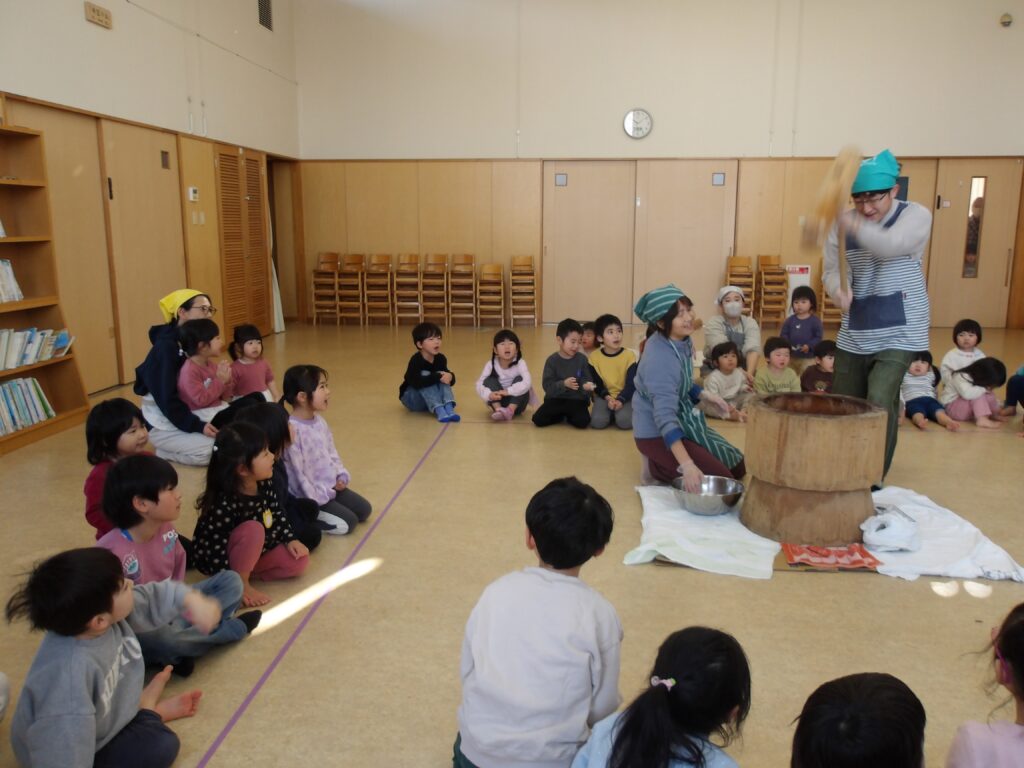 乳児さんも幼児さんもみんなホールに集まり、もちつき会のスタートです!