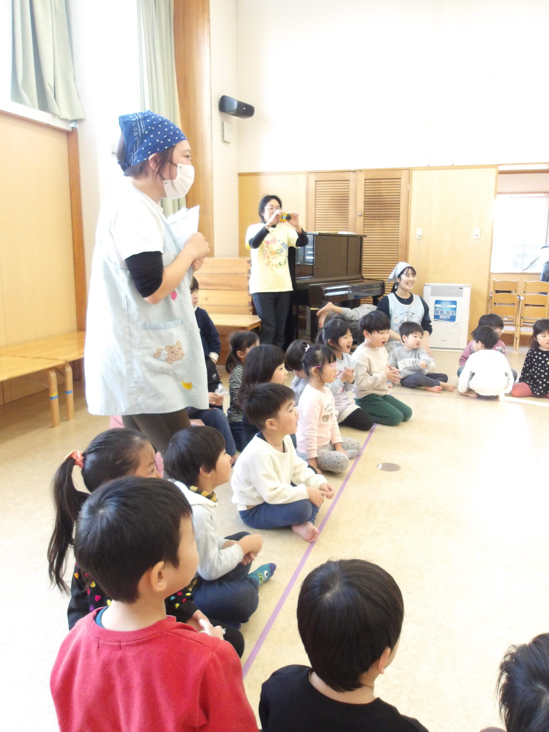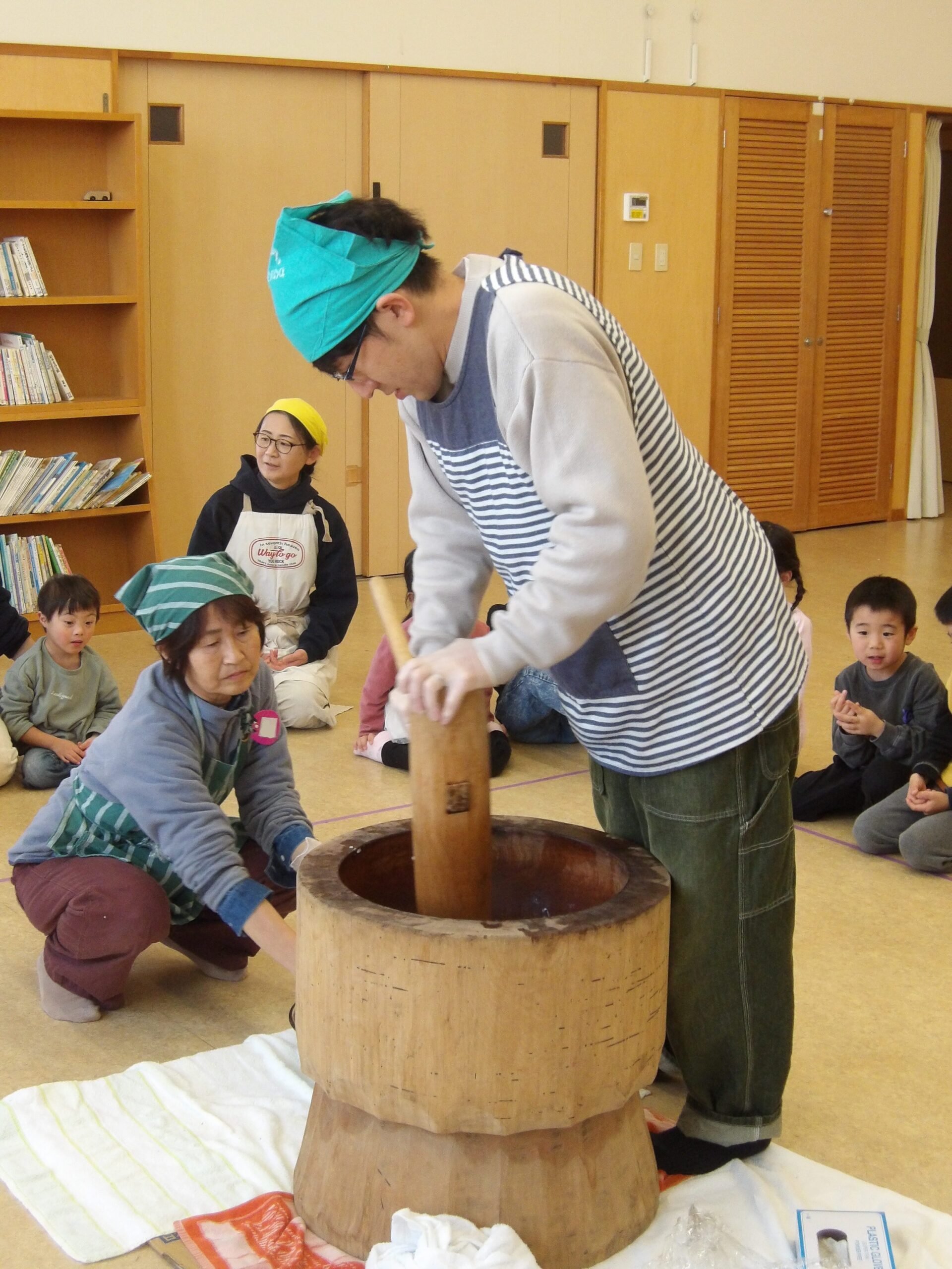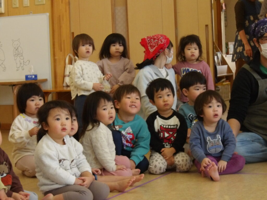 乳児さんも幼児さんもみんなホールに集まり、もちつき会のスタートです!