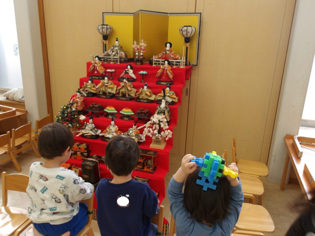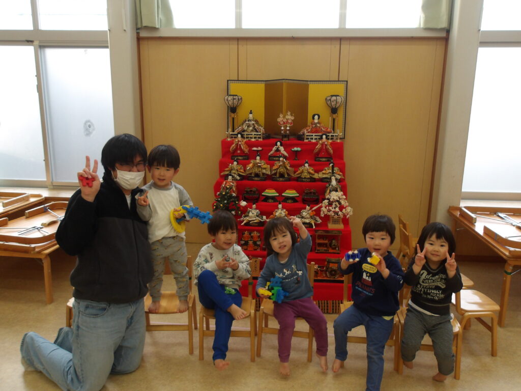 お昼寝から起きた2歳児ぶどう組と1歳児もも組の子どもたちが、雛人形に気づき、興味津々👀